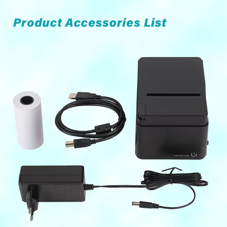 1. Pachetul include: imprimantă de chitanțe de 80 mm, rolă de hârtie, cablu USB, manuale, adaptor.